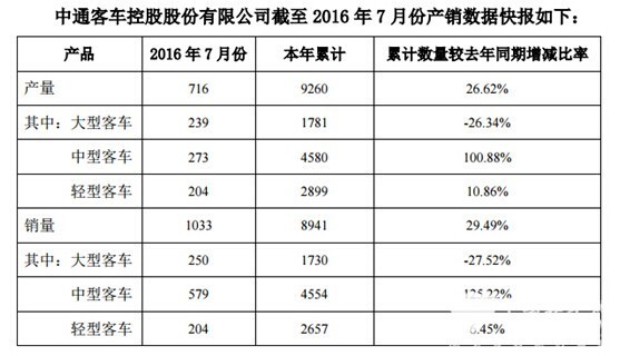 中通客车控股股份有限公司截至 2016 年 7 月份产销数据快报如下: