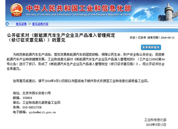 为规范新能源汽车生产活动,落实发展新能源汽车的国家战略,保障公民生命、财产安全和公共安全,促进新能源汽车产业持续健康发展,工业和信息化部对《新能源汽车生产企业及产品准入管理规则》(工产业【2009】第44号公告)进行了修订,形成了《新能源汽车生产企业及产品准入管理规定(修订征求意见稿)》(以下简称征求意见稿),2016年8月12日公开征求社会各界意见。