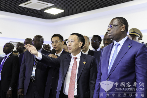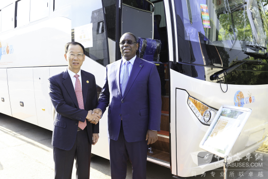 塞内加尔总统萨勒与苏州金龙总经理黄书平在海格客车前合影