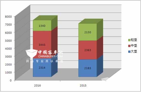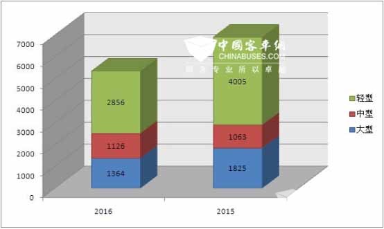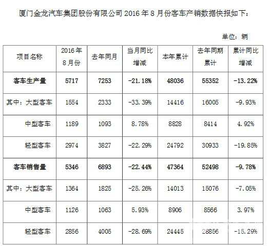 厦门金龙汽车集团(包括大金龙、金旅、苏州金龙)8月共销售客车5346辆,同比2015年下降了22.44%。轻型客车是销售主力,但是下降最为明显。中型客车销量相比2015年有所增长。