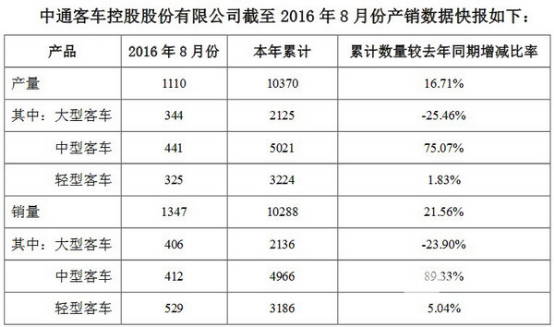 中通客车1-8月份总销量10288辆,同比上涨21.56%,其中大型客车销量同比下降23.9%;中型客车1-8月累计销量与2015年同期相比大幅增长,达到89.33%。可以看出,中通累计销量的增长,正是得益于中型客车。