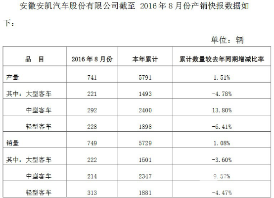 安凯客车1-8月份总销量5729辆,同比上涨1.08%,与2015年同期基本持平。其中大型客车销量同比降9.57%;中型客车1-8月累计销量与2015年同期相比有所增长,达到9.57%。轻型客车同比有小幅下降。安凯客车销量增长也得益于中型客车。