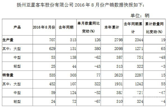 亚星客车8月销售客车535辆,1-8月累计销售1242辆。与2015年同期相比,大型客车数量猛增。中型客车,轻型客车下降明显。值得一提的是,亚星客车与2015年同期相比,在大型客车市场表现活跃,同比增长非常显著。