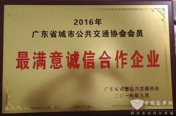 近年来,金旅新能源车遍布广东省内,如广州二汽、汕头市公共交通总公司、韶关市公共汽车有限公司以及惠州、佛山、江门等多个公交运输企业。3000多辆奔驰在广东街头的金旅新能源客车,为客户创造了良好的经济效益及社会效益,更为城市提供更舒适便捷的出行交通工具,深受公交企业和市民的认可。凭借其过硬的产品质量和周到高效的服务,此次金旅公司被大会授以——最满意诚信合作企业的称号。