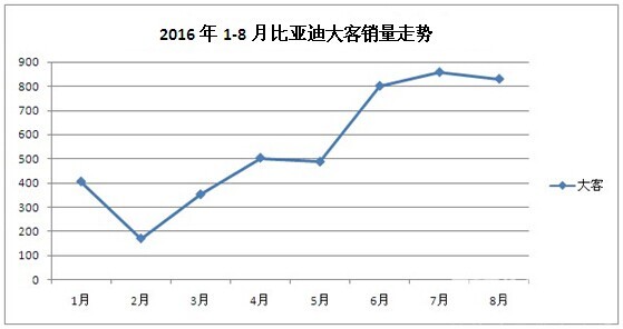 相比大型客车,中型客车在前八月的表现似乎不太稳定。前八月共销售中型客车863台,只有大型客车销量的20%。为了弥补此短板,比亚迪客车在2016年5月推出纯电动客车K6,标志着比亚迪首次进入6-8米纯电动公交领域。2016年6月,K6首次投入深圳南山区试运营。比亚迪K6纯电动巴士的投入使用,是南山区落实“城市管理治理年”的重要举措,将有效攻破“最后一公里”这一城市公交服务盲点和难点。8月份,比亚迪中型客车的销量出现了较大的增长,未来,比亚迪中型客车是否还会保持这样的增长,需要时间来回答。