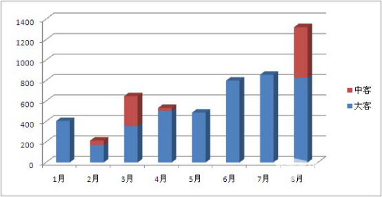 2016年1-8月,比亚迪客车在大客与中客市场销量一直保持增长。尤其是大型客车市场,发展迅猛。(如下图)