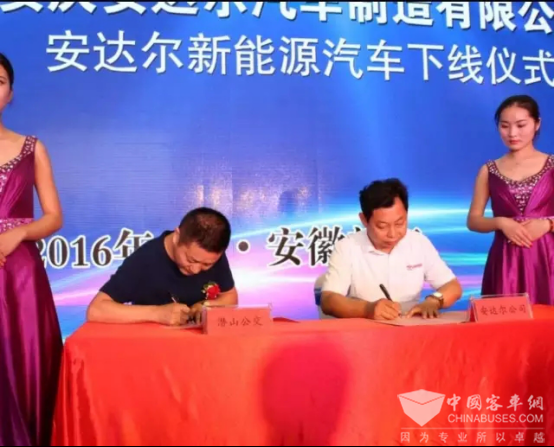 安达尔新能源汽车四款车型的顺利下线得到了各级政府领导及广大用户的肯定与认可。本次活动中,安达尔公司先后与望江县公交公司、桐城市公交公司、潜山县公交公司及枞阳县公交公司签订购车协议,共签约安达尔汽车订单240余辆。活动现场的陆续签约,市场投放的良好反响,充分彰显了安达尔新能源汽车的卓越品质及智能引领。