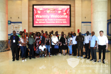 2016年9月18日“2016年非洲国家贸易投资研修班”赴深圳市五洲龙汽车股份有限公司参观学习,参观团队由非洲的埃及、肯尼亚、厄立特里亚、马拉维、加纳、乌干达、南非、赞比亚等国的政府官员、教育界人士组成,在五洲龙国际营销公司副总经理的陪同下,共同参观了五洲龙研发成果展示厅、新能源汽车实验室、生产车间等,同时还试乘体验了五洲龙生产的VIP机场摆渡巴士和纯电动公路客车等。