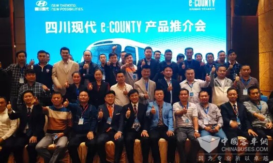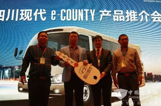 为了增进用户对e-COUNTY的认识,四川现代商品策划部唐贤云先生详细介绍了e-COUNTY的产品特性,其动力、外观、内饰、安全性能等方面的卓越表现,得到了来宾的一致好评,到场的一些客运公司、旅游公司等客户代表对该款新车表现出了极大的兴趣。会上,四川现代还举行了交车仪式,并将代表财源滚滚的金钥匙交到了客户手中。