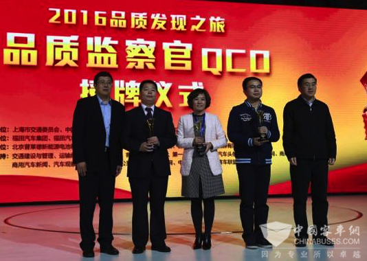 2016品质发现之旅品质三官授牌仪式 当然,“2016品质发现之旅”也已成为福田欧辉在深化转型、提升内涵的重要一环。未来,福田欧辉将在混合动力、纯电动、氢燃料和高效节能发动机等领域,集结研发实力和品牌能量,做到制造专业化、运营商业化、服务体系化的品质体验;集成康明斯动力优势、戴姆勒工业制造优势,打造出完整品质生态链,满足客车消费从“有”到“优”的需求升级、实现企业经济效益向社会效益转化、推动交通运输行业信用体系建设。