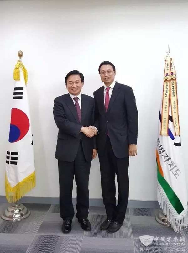 比亚迪亚太汽车销售事业部总经理刘学亮(右)拜会济州特别自治道知事元喜龙