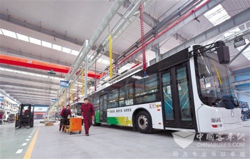 2016年11月17日,包头装备园区的工人们正在组装杉杉电动客车。
