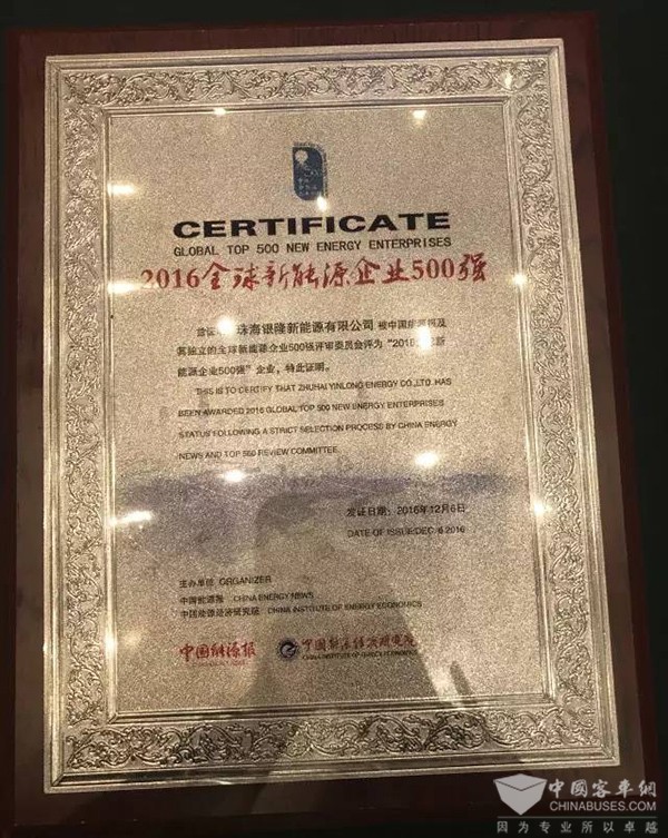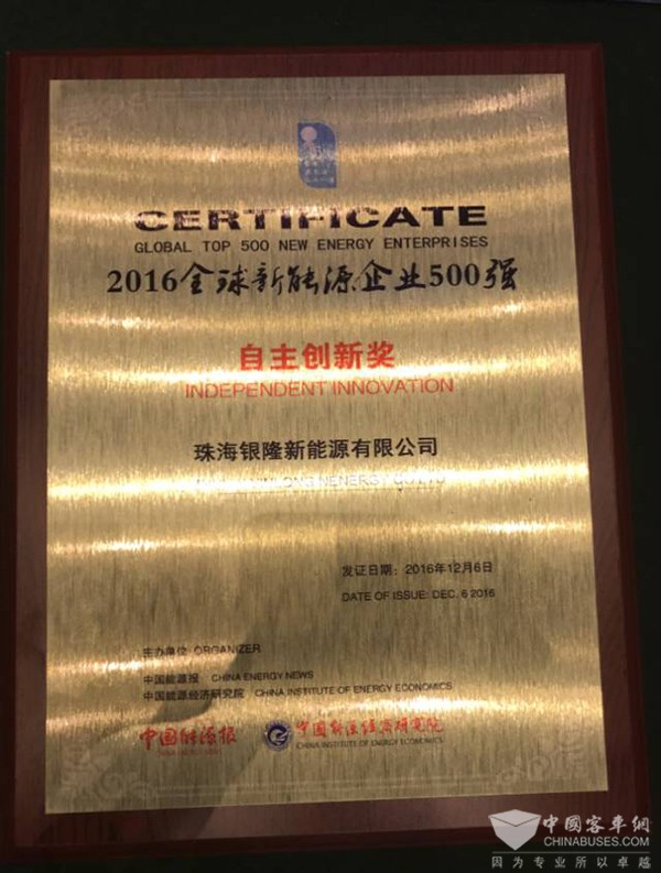 银隆新能源荣获2016全球新能源企业500强“自主创新奖”