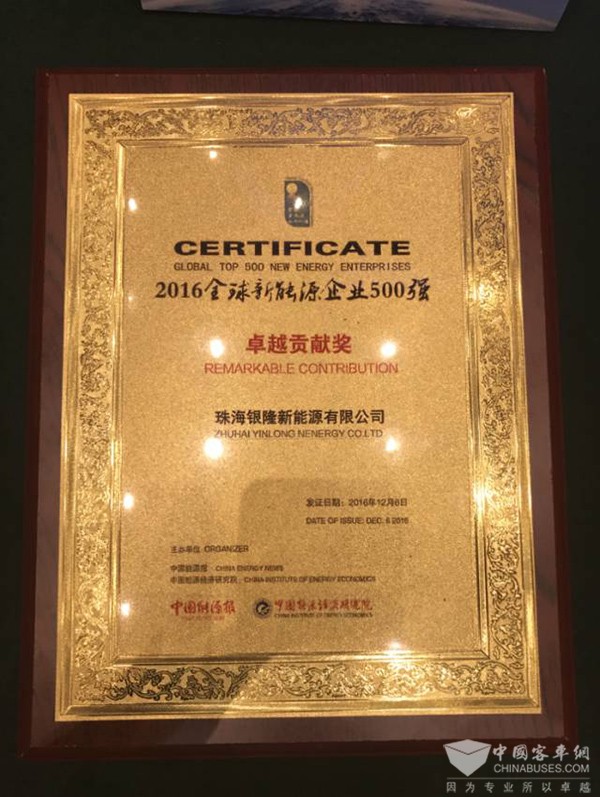 银隆新能源荣获2016全球新能源企业500强“卓越贡献奖”