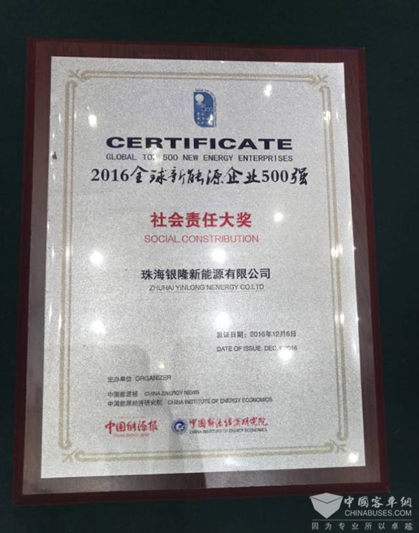 银隆新能源荣获2016全球新能源企业500强“社会责任大奖”
