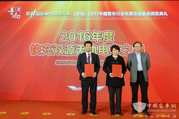 获得“2016年度快充双源无轨电车之星”的是福田欧辉BJ6180在线充电纯电动城市客车,被称为18米长的“都市和谐号”,集节能减排、降污治堵、发展公交的"三合一式"解决方案,适用于大型城市干线道路和BRT线路,被称为大型城市旅客大规模迁移的绿色快速通道。采用欧辉自主研发的全新流线造型,车身线条流畅灵动、媲美商务高铁,堪称大城市公交高效运营的典范。目前已实现北京地区40台的销量,运营状态良好。