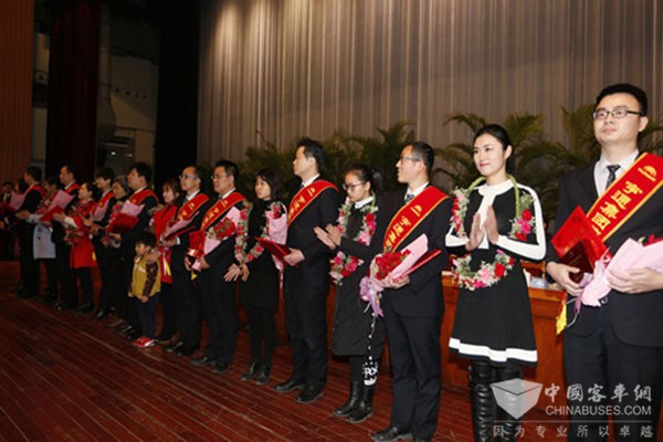 为总结经验,表彰先进,激励全体宇通人在2017年不断超越,再创辉煌,高标准实现集团各项经营管理目标,宇通对2016年度集团内部涌现出的先进个人和集体进行表彰。其中劳动模范10名,每人奖励60克金牌一枚,优秀共产党员10名、质量标兵10名、青年岗位能手10名、销售标兵10名,每人奖励50克金牌一枚。同时,宇通还对“先进集体”“客户服务‘真心英雄’奖”“最佳销售支持奖”“最佳创新奖”“效率优胜奖”“协同精神奖”“终身奉献奖”“最佳新人奖”等年度特别奖的获奖集体和个人进行表彰,通过标杆选树来倡导践行以客户为中心、高标准工作、拼搏奋斗、忠诚敬业、开拓创新、精诚协作、效率提升等行为,持续增强企业综合竞争力。