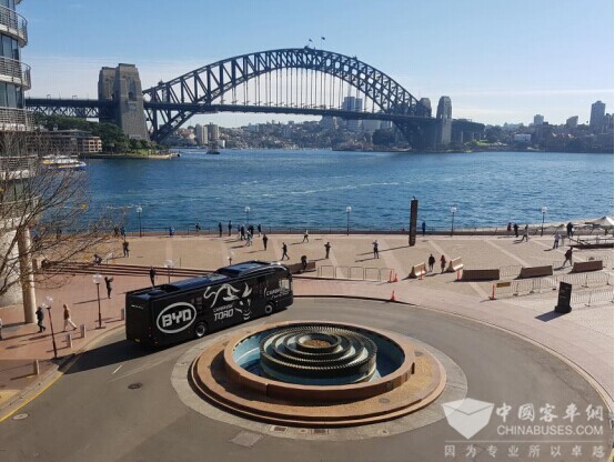 路试当中的比亚迪电动巴士,远处是当地地标悉尼大桥