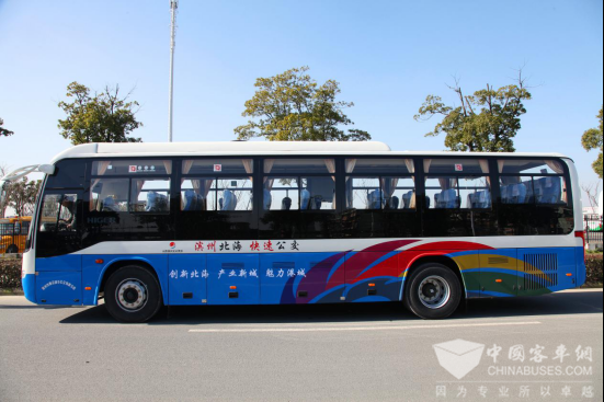 北海经济开发区至滨州汽车总站的线路全程约110公里,用时2小时;双向运营,初期各4个班次,目前根据客流实时增加班次,因为班线较长,采用普通公交车,舒适性会差一些,所以滨州交运选用高端豪华乘坐舒适的海格客车,为乘客打造舒适惬意的出行体验。