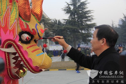 早上7点45分左右,汤总执笔蘸墨亲自为双龙点睛,随后两条巨龙腾空而起,寓意宇通如蛟龙出海破浪前行,也预示着宇通事业将在新一年实现新突破、取得新成就、再创新辉煌。
