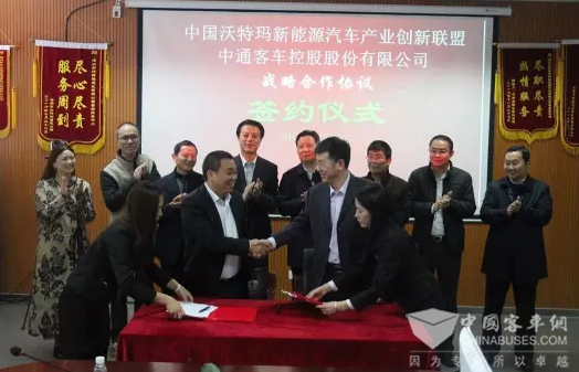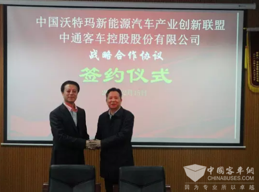 2017年2月15日, 中通客车控股股份有限公司与中国沃特玛新能源汽车产业创新联盟签署战略合作协议。双方将以新能源汽车领域合作为契机,建立长期、具有建设性的战略合作伙伴关系。沃特玛创新联盟理事长/沃特玛集团董事长李瑶、沃特玛集团总裁李金林、中通客车总经理孙庆民、聊城中通轻型客车有限公司董事长囤金军等出席签约仪式。