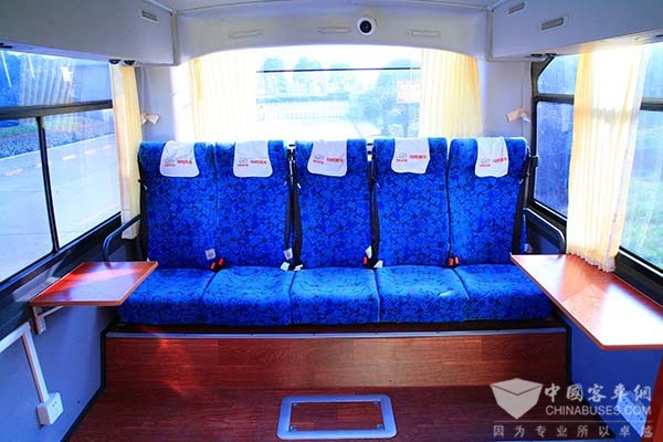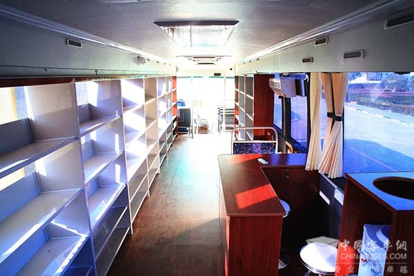 为了确保车辆功能齐全、乘坐舒适,海格工程师们与宋兆凯耗时两个月,共同对车身的每一处细节进行定制设计,无论是静音发电机,还是车内的桌椅、灯光,都凝聚了精巧的匠心智慧。车顶左右两侧条状式阅读灯全面覆盖车内空间,柔和光线呵护阅读双眼;典雅办证桌椅轻松摆放自动办证机、自动借阅机,方便设备推送;车身后侧安置便携式可折叠阅读桌,随时随地即可读书;大功率吸顶式空调、环绕式通风口时刻保证车内空气清新、温度怡人。