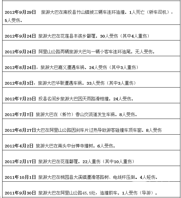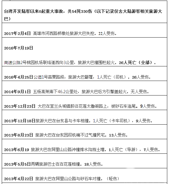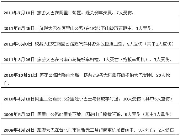 据XINGKONG.COM不完全统计,从当前倒推至2009年,台湾发生过多起旅游大巴事故,其中仅涉及到大陆游客的旅游大巴事故就有30起,共造成54人死亡,330人轻重伤(2017年2月13日事故未见陆客报道,未做统计),具体情况见下表: