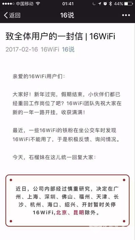 2017年2月16日,公交WiFi运营商“16WiFi”在官方微信号“16说”发布致全体用户的一封信,信中称决定在广州、上海、深圳、佛山、福州、天津、长沙、杭州、海口、绍兴、开封暂时关停,仅保留北京和昆明两城作为样板城市。根据16WiFi的声明分析,公司将做上述决定的原因归结为高额成本的巨大压力、后向运营模式受阻、没有政府资金的支持三大原因。