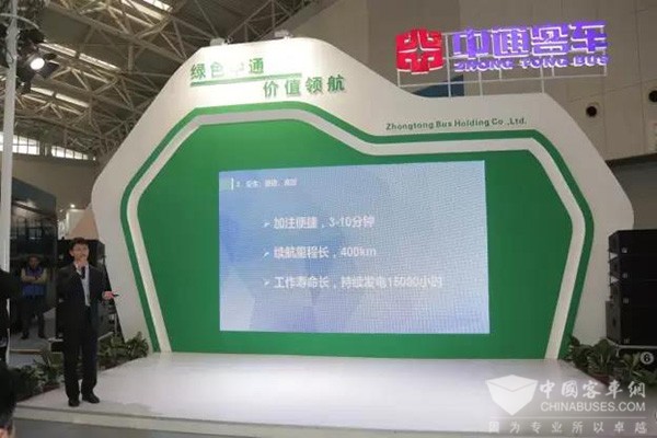 中通客车品牌文化部部长李笃生对此款新品进行了介绍。据了解,此次中通客车发布的12米燃料电池客车,是中通传承十余年新能源客车研发精髓,经过系统市场调研推出的新能源精品,可以满足大中型城市公交以及团体用车需求。该产品燃料电池额定功率为60KW,辅以锰酸锂动力电池,使燃料电池尽可能工作在最佳效率区间。同时,该产品采用低入口设计,前后均设置双内摆门,大大提高了乘客上下车的方便性和速度;6700mm大轴距设计,车内空间分布更加合理。