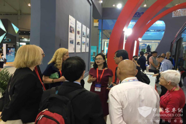 银隆新能源营销十一部总经理张玲(中)为中外客商介绍银隆产品