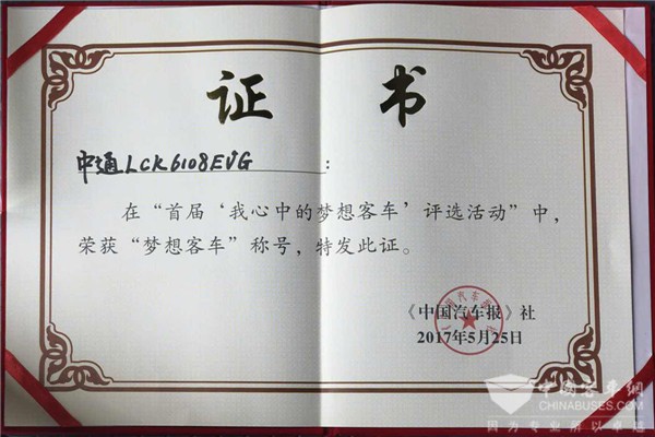 5月25日,在《中国汽车报》组织的首届“我心中的梦想客车”评选中,中通此款产品获评“梦想客车”,更是证明了此款产品的优良性能,也更坚定了中通客车打造优秀产品、服务绿色交通的信心。