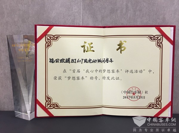 福田欧辉BJ6117纯电动城间客车荣获“梦想客车”称号