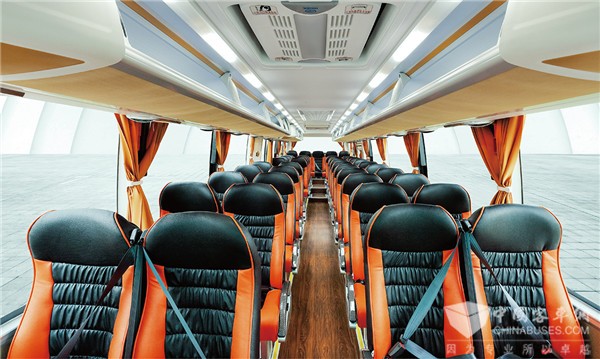 车辆的走道宽度达到高一级等级350mm的要求,有效保证了座位的舒适宽敞,适合旅游出行。乘客的座椅也是非常靓丽的地方,座位采用了小型商务座椅的设计,靠背采用了符合人体工程学的包裹式设计。在座椅的外侧有一个红色的警示灯,车辆行驶时乘客未系安全带这个警示灯会亮起提示。