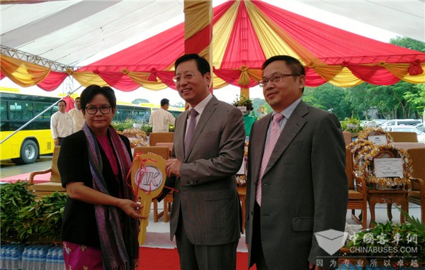 在接车仪式现场,中国驻缅甸联邦共和国大使代表洪亮先生从安凯客车副总经理程小平手上接过“金钥匙”,郑重移交给仰光省交通部长,并对安凯客车表达了赞赏与鼓励:“在与缅甸方面的合作中,安凯客车不畏困难加班加点,在极其短暂的交货期内高质量地顺利完成了仰光公交的合作任务,未来以此为契机,安凯客车还要再接再厉做好本地化服务。”