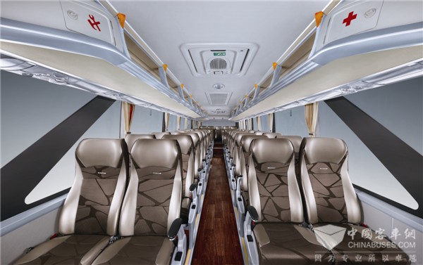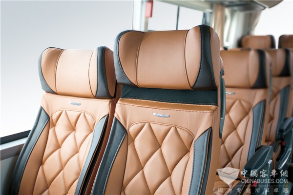 龙威Ⅱ代独特的内饰设计同样体现了金龙人的匠心。色彩选择上,跟随国际流行的趋势,提供6色的内饰供选择,造型以视觉舒适为原则,趋于简洁、工整,更加注重多种材质的应用、搭配。同色系色彩搭配的形式,豪华大气的冷色基调保证了内饰本身的豪华和视觉舒适性,用暖色座椅辅面料来搭配,使车内整体配色丰富多彩、赏心悦目。