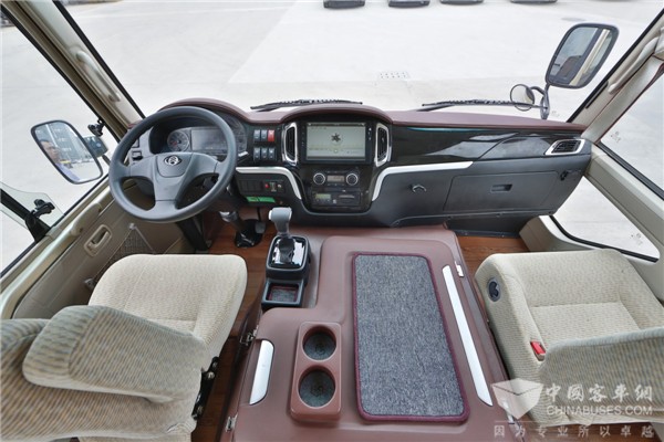 除动力升级外,领航版考斯特的内饰设计也让人眼前一亮。首先仪表台造型完全跳出考斯特固有的风格,整体感更强的横向贯通式设计具有明显的轿车化风格。位于中部的液晶显示大屏幕与采用软包处理的仪表台为车内营造出浓郁的商务气息。领航版考斯特内饰最出彩的地方是它的配色处理,以黑色为主色调凸显出稳重和大气;红褐色的仪表台表面与发动机罩相互呼应,让驾驶区看上去更富有质感;在空调出风口和仪表台局部采用反光装饰材料,起到活跃氛围的作用。在乘客区的处理上,也显示出金旅在考斯特车型上的技术底蕴。车顶部和风道虽没有采用整体成型工艺,但通过调整压条位置等精细的处理方式,在不提高成本的情况下取得了应有的效果。可以说,小到空调出风口造型,大到车窗及顶部各部分的空间比例,金旅精益求精的造车理念在领航版考斯特内饰上得到充分体现。