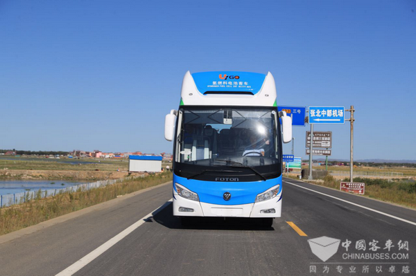 试验车从张家口市区到野狐岭,海拔由700米连续上升到1500米,车体运行状况非常优秀,爬坡动力充沛,高速乘坐十分舒适,车内噪音极低,仅有空调和风机运行的声音。尤为值得一提的是,福田欧辉量产化8.5米氢燃料电池车完全可以实现零下30度超低温启动,零下46度低温存放,极大保证了该车能够适应张家口冬季恶劣的寒冷天气,受到了张家口市政府的高度好评。
