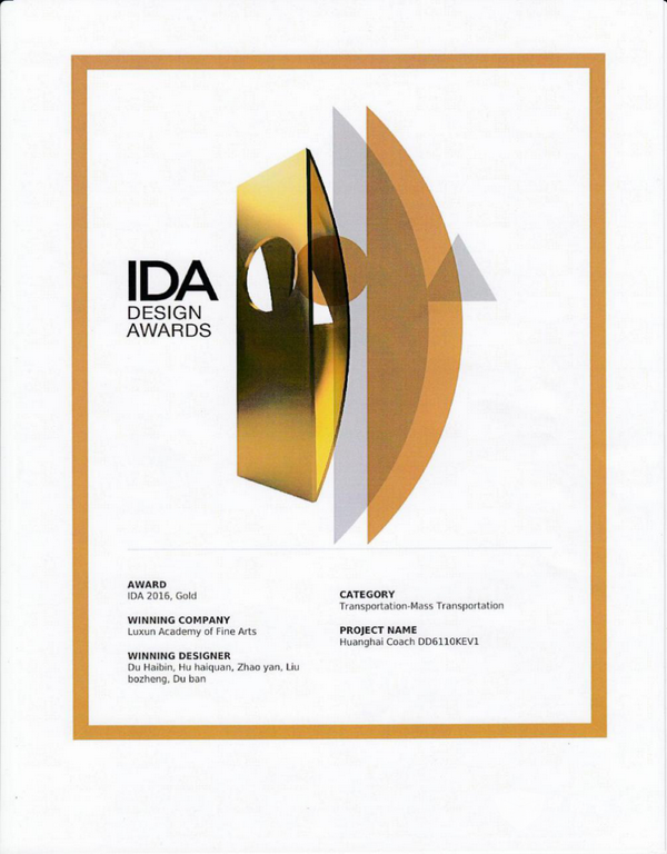 本届“IDA国际设计大赛”共有来自全球200多个国家和地区的选手参加,面向全球征集已经投产上市的两年之内的优秀产品设计,共收到来自全球52个国家万余件投产作品。其中,黄海客车与鲁美设计学院团队协同设计的“Huanghai coach DD6110KEV1黄海纯电动城际客车”是中国参赛交通机具类比赛的唯一金牌获得者,纵观中国客车业可谓“前无古人”。