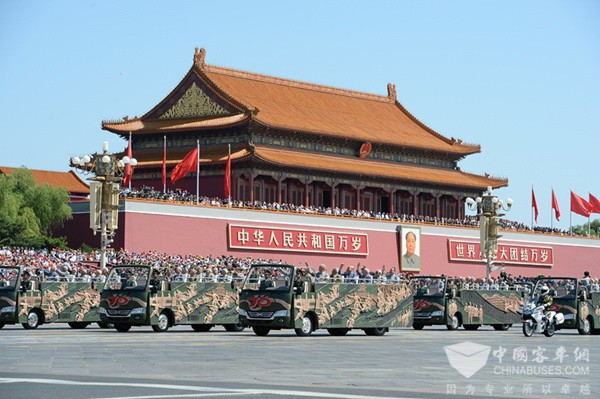 阅兵现场,为缅怀先烈、敬仰英雄、体现对抗战老兵的尊重,两个抗战老兵方队乘坐敞篷车,由国宾摩托车护卫队拱卫在前、后、左、右,呈箭头状护卫进场。老兵们通过天安门时庄严敬礼的画面,深深感动了亿万观众。而同时被历史定格的,还有载着老兵们荣耀受阅的敞篷版安凯宝斯通客车。