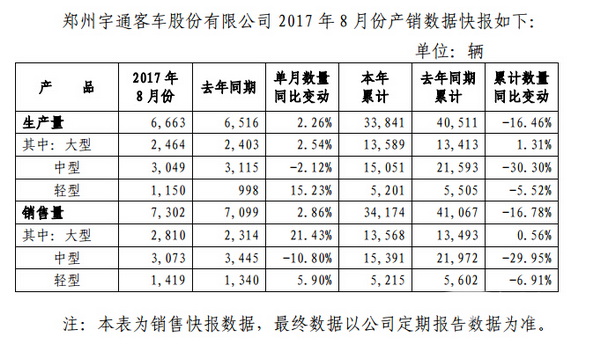 轻客方面,2017年8月份产销双升,轻客生产1150辆,销售1419辆,整体增势平稳。