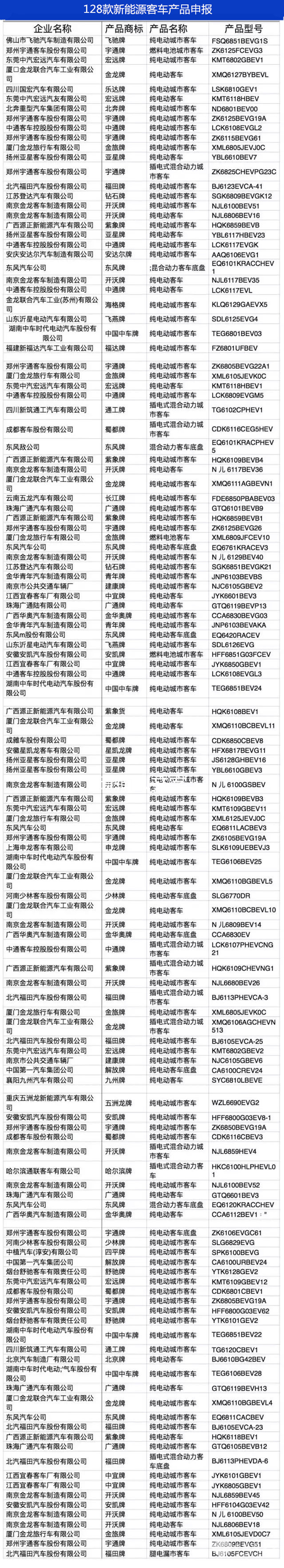 第300批《道路机动车辆生产企业及产品公告》中,申报的新能源汽车产品共有109家企业的320款车型,包括39家企业的128款新能源客车产品(含底盘10款),占比40%。其中,纯电动客车产品有111款,包括底盘6款;插电式混合动力客车产品13款,包括底盘4款;燃料电池客车产品有4款。