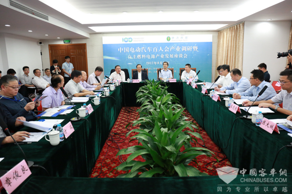 电动汽车百人会与会领导参加座谈会此次活动,福田欧辉8.5米氢燃料电池客车再次现身,并作为参会嘉宾试乘车辆,以其出色的性能,展示了中国在燃料电池客车领域的先进研发技术。
