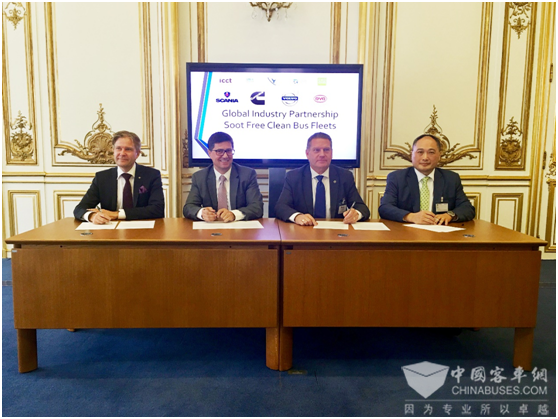 比亚迪欧洲汽车销售事业部总经理何一鹏(右一)与其他三家企业代表签署声明在此次举办的“全球低排放巴士项目”签约仪式上,联合国环境规划署执行主任埃里克•索尔海姆(Erik Solheim)表示,空气污染是当今世界最主要的环境问题,严重影响了数百万人的身体健康和生活质量。此次是全球领先公交车辆制造商和国际主要城市之间携手合作的里程碑,也是具有前瞻性的商业与民间团体合作共赢的典范,将对我们的星球、商业、投资和技术发展产生巨大的推动作用。
