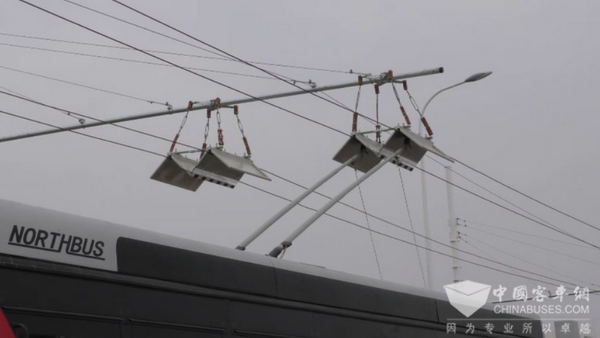 双源无轨公交的发展,充电弓从手动搭线到自动搭线,再升级到今天推出的自动感应捕捉充电,让驾驶员充电过程更灵活更方便。北方客车搭载的自动捕捉充电弓,可实现车辆与充电网线在1.5米范围内偏差的自动捕捉充电能力,驾驶员只需要按下充电按钮,集电弓就会准确无误地捕捉到空中充电线网,车辆滑出后自动充电,可实现多车边走边充,顺序移动充电。同时车顶还专门装有摄像头,以便驾驶员通过监控监测到集电弓的升降情况,从而及时调整车辆位置。
