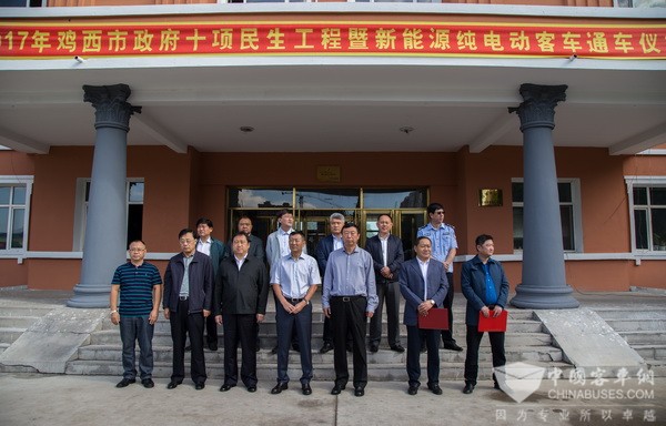 鸡西市市长张常荣(前排左四)及市里主要领导参加中通纯电动客车交车仪式