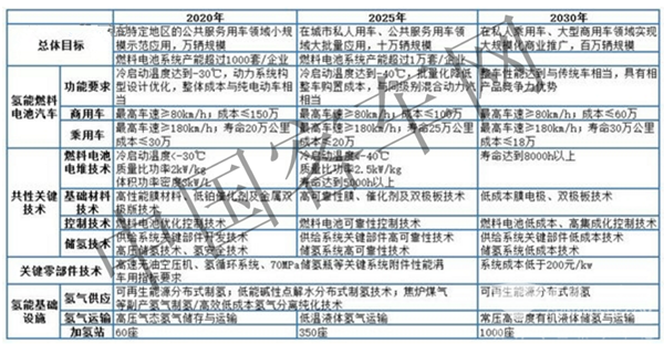 中国汽车工程学会在其年会上发布了《节能与新能源汽车技术路线图》,其中关于《燃料电池汽车技术路线图》2020年——2030年发展规划如下所示:
