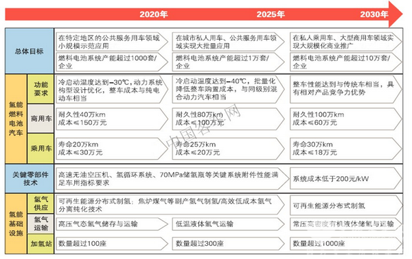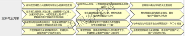 工业和信息化部、国家发展和改革委员会、科学技术部联合印发《汽车产业中长期发展规划》,燃料电池技术发展路线以2020年、2025年及2030年为三个关键时间节点,依据产品研发-制造验证-批量应用的规划思路,使车用燃料电池电堆的性能、寿命、成本三个关键指标依次达到商业化要求,并且完成电堆及关键材料的批量制造能力建设,满足燃料电池汽车发展需求。