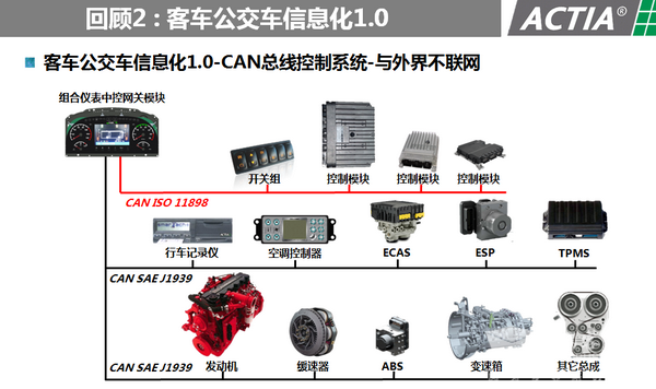 信息化前时代的客车公交车采用传统强电控制方式,CAN总线控制系统-与外界不联网。总线控制系统可以控制车身、车门等从而实现信息化,然而,信息传输线路却十分有限,无论负载有多少,只有两根信号线和一根电源线。