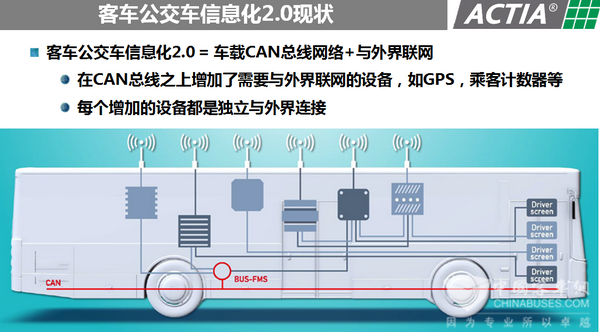 客车公交车信息化2.0 时代,车载CAN总线网络+与外界联网,在CAN总线之上增加了需要与外界联网的设备,如GPS,乘客计数器等。然而,每个增加的设备都是独立与外界连接,每个增加的设备都须使用自带的天线、显示屏和操作界面。