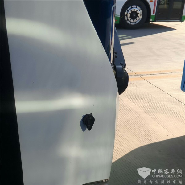 在参观中通十米纯电动公交时,我们注意到在每辆车的车前门前侧、车灯上部,都有一个小锁眼。据朱志峰介绍,这是一个针对前乘客门开关的电控锁。增加该锁后,驾驶员就可以在车外部,不用排气减压的情况下,通过钥匙来开闭车门,免去了每次打开气阀排压的麻烦。而且,该钥匙是与其他车门钥匙通用的。目前,该电控锁已在中通10米纯电动公交上实现了标配。
